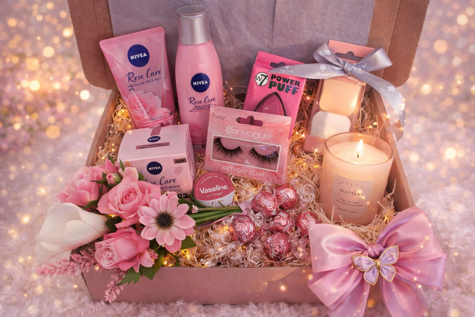 Introduce elegance and self-care together with the Blush Beauty Self-Care Gift Box β a beautifully curated luxury hamper designed to create a relaxing and glamorous gifting experience. This stylish gift box features a selection of skincare essentials, beauty accessories, sweet treats, and decorative floral elements carefully arranged inside an elegant presentation box. The soft pink theme adds a feminine and premium touch, making it a perfect ready-to-gift option for birthdays, celebrations, appreciation gifts, or surprise moments. Designed to bring comfort, beauty, and indulgence together, this hamper offers a spa-like self-care experience while maintaining a chic and modern aesthetic. Whether gifting a friend, loved one, or treating yourself, this beautiful box delivers charm, relaxation, and luxury in one stunning package.